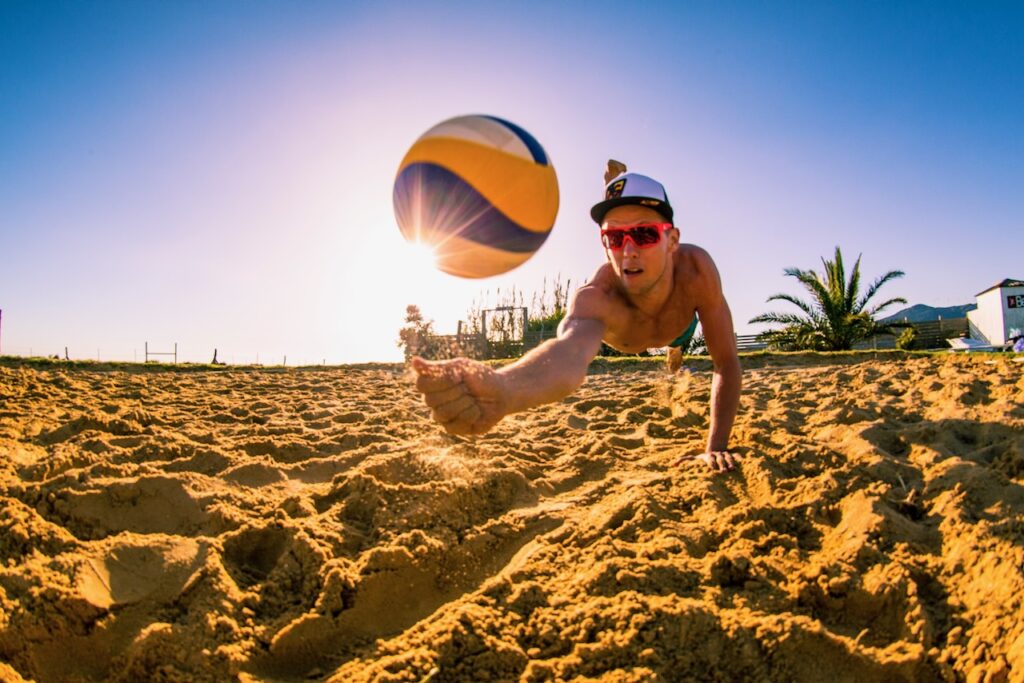 [Feat climbing a steep hill. Man climbing a steep peak while carrying a mountain bike on his back. Super fast shots of people in various activities. A VW Bus pulls up to a sunset]